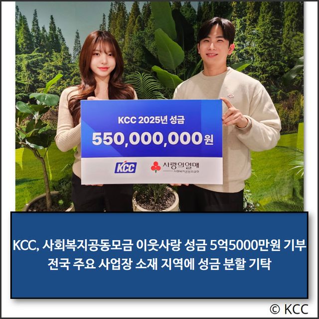 KCC(002380)가 사회복지공동모금회에 이웃사랑 성금 5억5000만원을 기부하며 지역사회를 위한 나눔 캠페인에 동참했다.