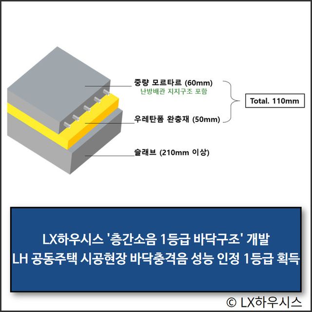 LX하우시스가 개발한 층간소음 1등급 바닥구조는 슬라브(210mm) 위에 우레탄폼의 완충재와 중량 모르타르가 적용된 구조다. 우레탄폼 완충재(50mm)와 중량 모르타르(60mm)를 총 110mm 구조로 설계, 기존 아파트의 바닥 마감층 두께와 동일해 두께를 늘리지 않으면서도 바닥 충격음을 줄였다.