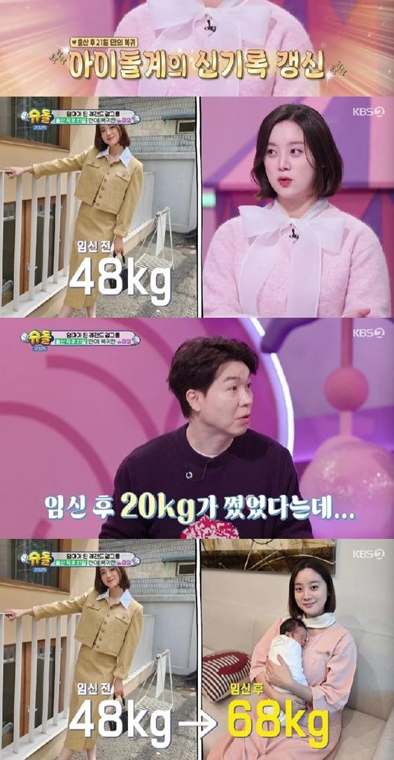 우혜림은 "임신 전에는 48kg이었는데 68kg, 69kg까지 쪘다. 지금은 10kg 빠지고 10kg 남았다"라고 이야기했다.