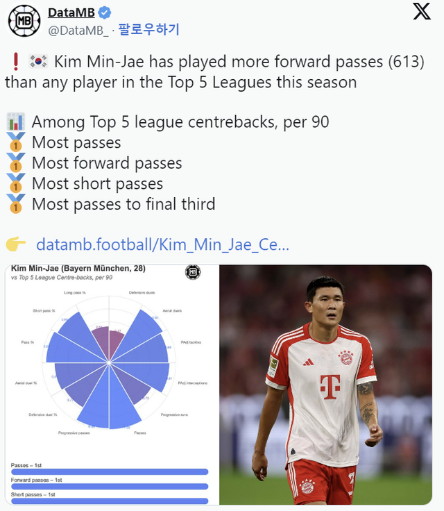 데이터MB는 특히 '90분' 단위가 아닌 이번 시즌 5대리그 센터백의 전체 전진 패스에서도 김민재가 613회를 기록해 1위라고 소개했다.