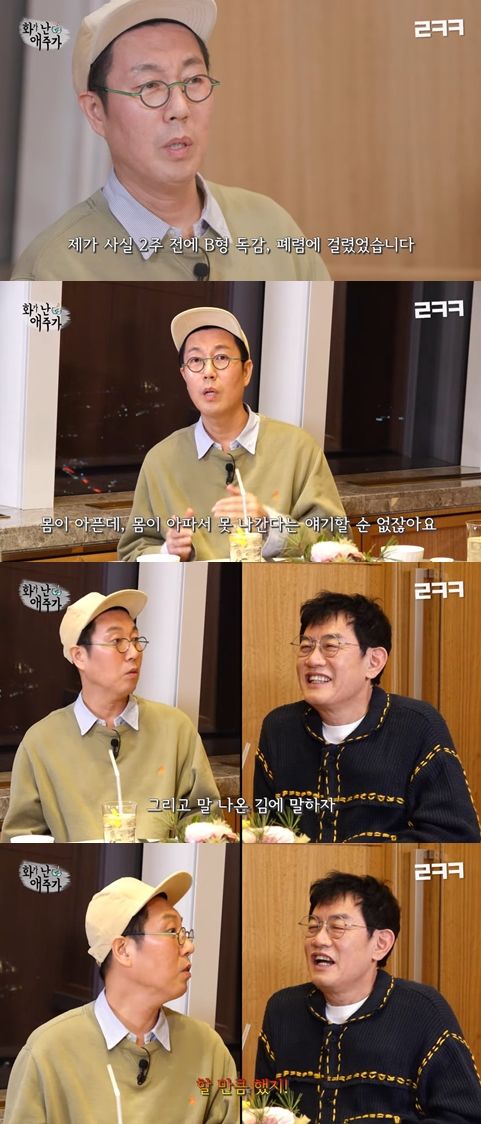 김영철은 "제가 사실 지지난주에 B형 독감, 폐렴에 걸렸었다. 몸이 아픈데, 몸이 아파서 못 나간다는 얘기를 할 순 없지 않냐"라고 해명했다.