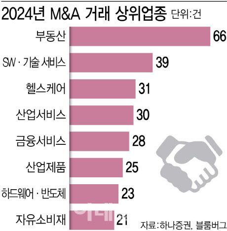 15일 하나증권과 블룸버그에 따르면 지난해 국내에서 완료된 M&A 360건 중 소프트웨어&기술 서비스 업종이 39건으로 부동산에 이어 두번째로 많았다. 헬스케어(31건), 산업 서비스(30건), K뷰티(15건) 등에서 거래가 다수 이뤄졌다.