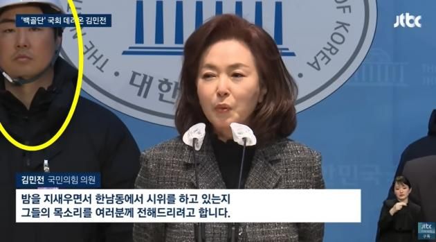 앞서 이 청년은 지난 9일 김민전 국민의 힘 의원이 주선한 백골단 국회 기자회견에서 김 의원 바로 뒤에 서 있는 모습이 포착되기도 했다.