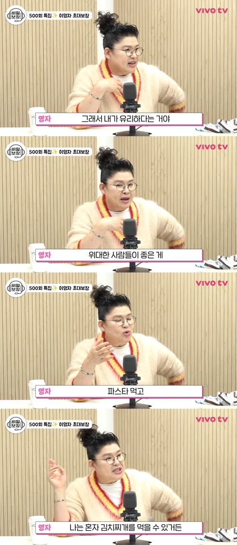 이영자는 "그래서 내가 유리하단 거다. 위가 큰 사람들이, 위대한 사람들이 좋은 게 파스타 먹고 나는 혼자 김치찌개를 먹을 수 있다"라며, 본인의 먹짱력을 어필했다.