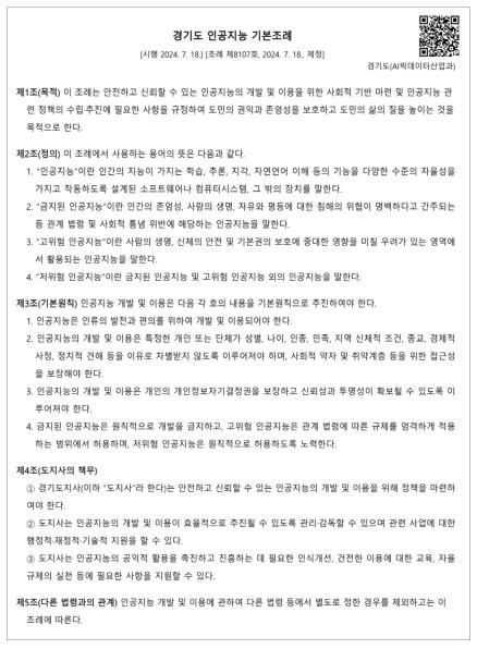 [와이뉴스] ‘AI 기본법’이 국회 본회의(2024.12.26.)를 통과함에 따라, 2024년 7월 18일에 제정된 ‘경기도 인공지능 기본조례’의 개정 필요성이 제기됐다. 이에 따라 조례 개정안에는 안전하고 신뢰할 수 있는 인공지능(AI) 개발과 이용, 도민의 권익 보호, 그리고 삶의 질 향상을 위한 정책을 수립하고 이를 반영해야 한다는 의견이 제시됐다.