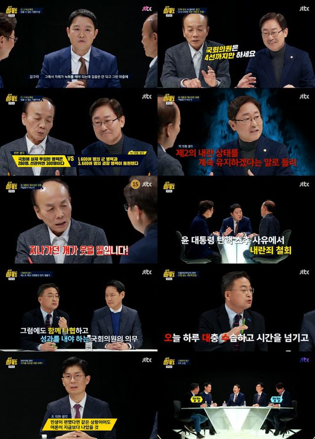 지난 15일 방송된 JTBC ‘특집 썰전’ 1회에서는 원년 MC 김구라의 진행 아래 ‘보수의 아이콘’ 전원책 변호사와 ‘판사 출신 법잘알’ 더불어민주당 박범계 의원이 논객으로 등장해 한 치의 양보 없는 논쟁을 펼쳤다. 여야 4당 초·재선 의원인 더불어민주당 김한규 의원, 국민의힘 조정훈 의원, 조국혁신당 신장식 의원, 개혁신당의 이준석 의원은 ‘여야의 밤’ 코너를 통해 각 당의 현안은 물론이며 ‘내란 특검법’을 두고 치열한 공방을 벌였다.
