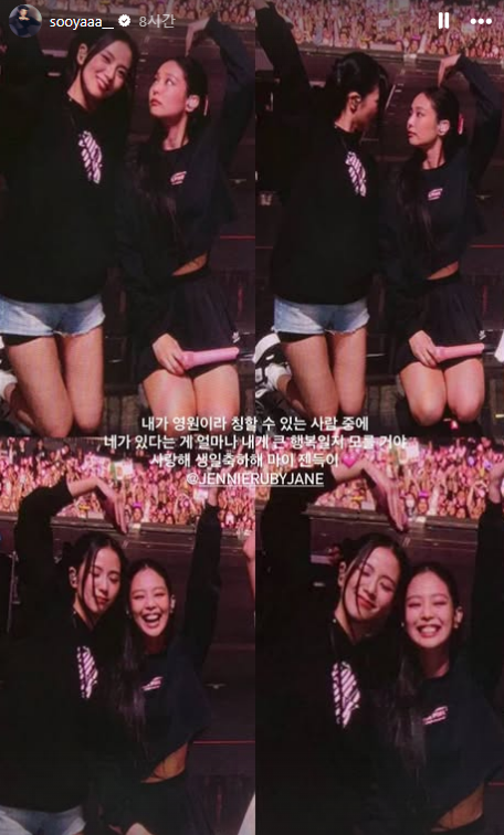 이와 함께 지수와 제니가 한 공연장에서 활짝 웃으며 다정한 분위기를 자아내는 사진을 올렸다.