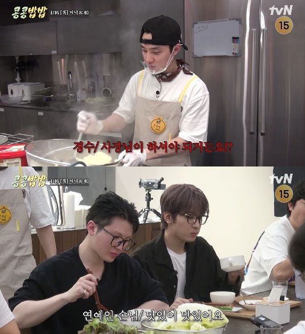 도경수 표 특제 된장찌개를 필두로 저녁 메뉴가 착착 준비되던 가운데 예상치 못한 반가운 손님 세븐틴이 등장해 이광수와 도경수를 놀라게 만든다. 세븐틴은 난생처음 들어보는 요리명에 고개를 갸웃거리며 “감자탕 스타일이 느껴진다”라는 묘한 식사평을 남겼다.