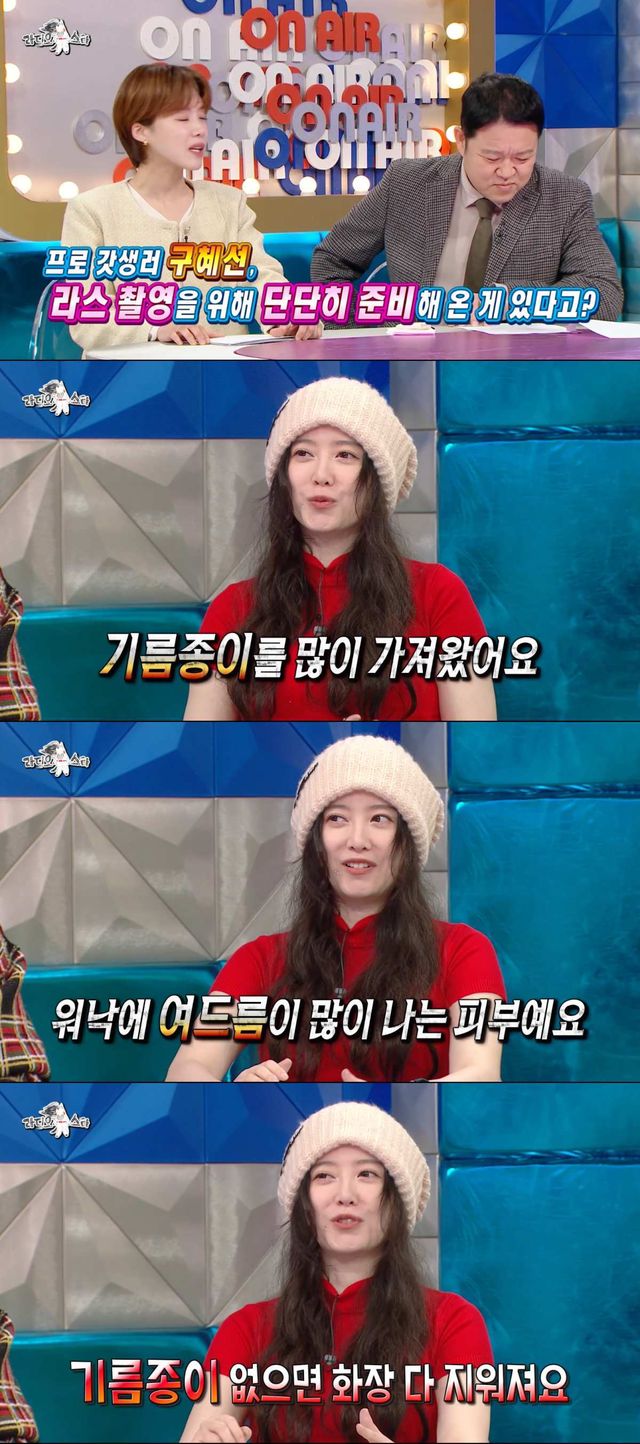 이날 구혜선은 ‘라스’ 촬영을 위해 기름종이를 많이 가져왔다고 밝혔다. 그는 “워낙 여드름이 많이 나는 피부다. 그래서 기름종이 없으면 화장이 다 지워진다. 하루에 10장 이상 쓴다”고 설명했다.