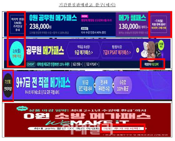 공정위 조사에 따르면 메가스터디는 2016년 10월 19일부터 2023년 7월 3일까지 통상 1주일 간격으로 누리집 및 모바일 앱을 통해 공무원·소방·군무원 등 상품을 판매하면서 △‘마지막 구매기회’ △‘O요일 최종판매 종료’ △‘O요일까지 특별 판매마감 임박’ △‘이번 주가 마지막’ 등의 표현을 사용해 광고했다.