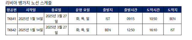 터키항공의 벵가지 노선은 B737-78D항공기를 투입해 매주 화요일, 목요일, 일요일 주 3회 운항된다.
