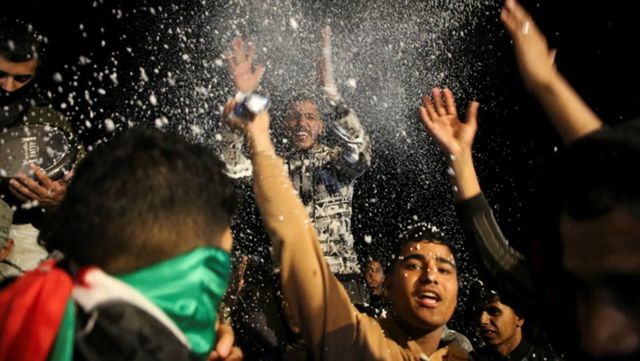 이스라엘과 하마스 간 휴전 합의 소식이 알려진 15일(현지시간) 가자지구 남부 칸 유니스에서 팔레스타인 주민들이 거리로 뛰쳐나와 환호하고 있다. /로이터 연합뉴스