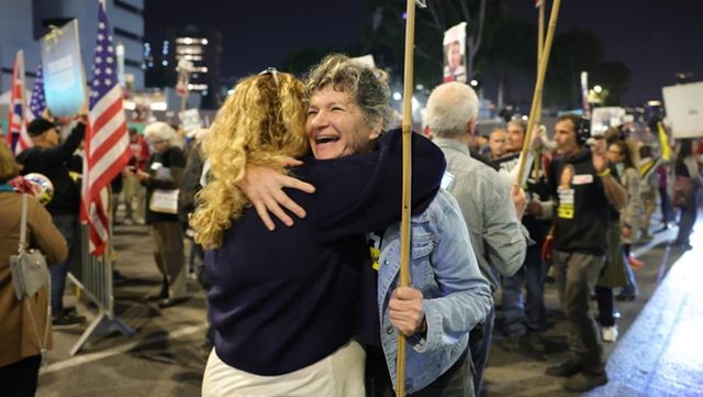 15일(현지시간) 휴전 합의 소식을 들은 이스라엘 인질 가족들이 기뻐하고 있다. /EPA 연합뉴스
