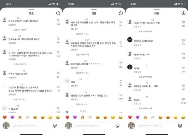 “좌이유(좌파+아이유)”, “중국 간첩 아니냐?”, “국민 여동생 타이틀 아웃”, “이런 세상 만들어서 속이 시원하냐” 등 공격적인 댓글이 줄을 잇고 있다.