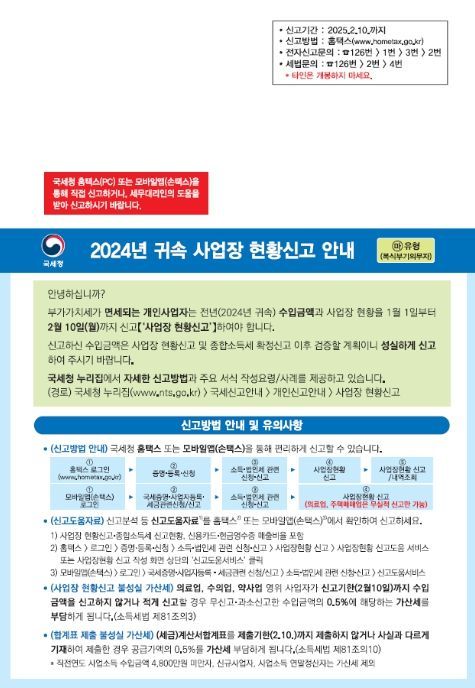 국세청은 주택임대사업자 등 면세사업자 158만 명에게 2024년 귀속 사업장 현황신고 안내문을 2025년 1월 20일부터 모바일로 발송한다.
