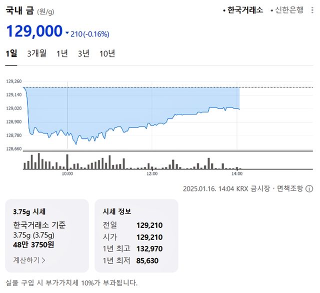 국내 금시세(금값)가 16일 오후 하락세(전 거래일 대비)를 보이고 있다.