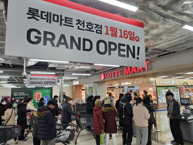 이날 방문한 롯데마트 천호점은 오픈 시간인 오전 10시를 약 20분 앞둔 시점부터 긴 대기줄이 형성됐다. 롯데마트 천호점은 2019년 8월 롯데몰 수지점에 이어 신규 출점한 곳으로 아파트단지 지하 1층에 4538㎡(약 1374평) 규모로 조성됐다. 롯데마트 천호점 인근은 이마트 천호점 등 대형마트가 3곳이나 영업하고 있어 오프라인 유통업체들의 격전지로 꼽힌다.