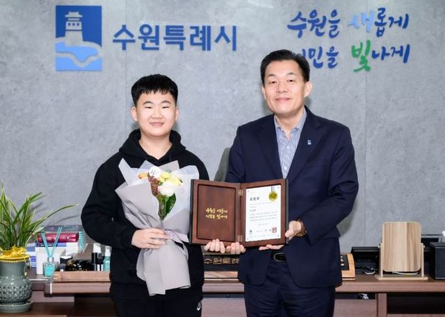 [와이뉴스] 이재준 수원시장이 공항참사가 일어난 무안국제공항에서 최연소 자원봉사자로 활동한 전시윤(12, 수원 파장초 5학년)군에게 16일 집무실에서 수원시장 표창을 수여했다.