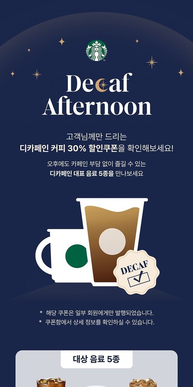 스타벅스는 이벤트 공지에서 "고객님께만 드리는 디카페인 커피 30% 할인 쿠폰을 확인해 보세요. 오후에도 카페인 부담 없이 즐길 수 있는 디카페인 대표 음료 5종을 만나보세요"라고 밝혔다.