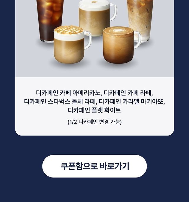 이번에 제공된 해당 쿠폰으로 할인받을 수 있는 스타벅스 음료는 '디카페인 카페 아메리카노', '디카페인 카페 라떼', '디카페인 스타벅스 돌체 라떼', '디카페인 카라멜 마키아또', '디카페인 플랫 화이트' 5가지다.