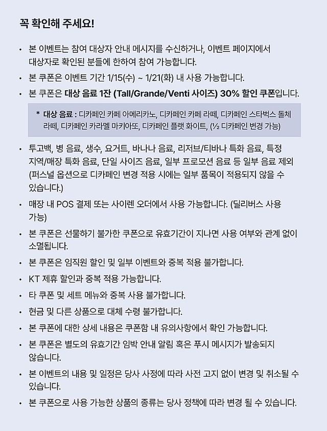 다음은 스타벅스의 '디카페인 커피 30% 할인' 이벤트 공지 내용이다.