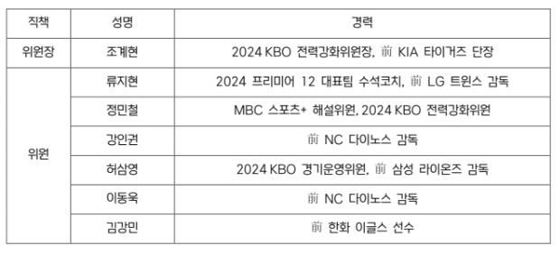 조계현 위원장을 중심으로 류지현(전 LG 트윈스 감독) 위원과 정민철(전 한화 이글스 단장) 위원이 대표팀 코치 경력을 살려 전력강화위원회의 한 축을 담당한다. 최근까지 KBO 리그 사령탑으로 활동했던 강인권·허삼영·이동욱 위원을 비롯해 지난해까지 선수로 뛰었던 김강민도 현장감을 살려 전력강화위원회 업무를 지원한다. 전력강화위원회는 첫 회의를 개최하고 대표팀 전임 감독 후보 추천을 논의할 예정이다.