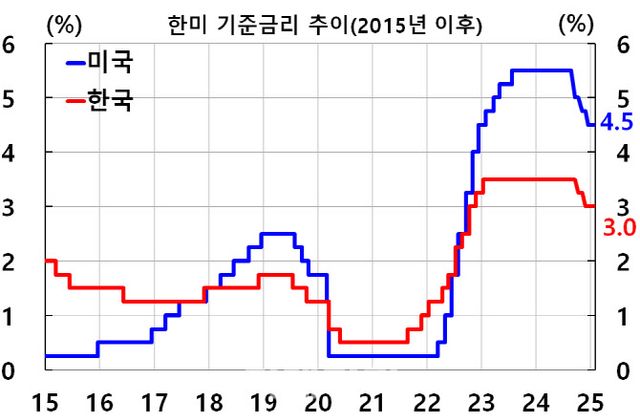 금통위의 통화정책방향 결정문을 보면 한은의 양대 책무인 물가와 금융안정에 대한 경계감이 이전에 비해 높아진 점이 확연히 드러난다. 급격하게 오른 환율 때문이다. 미국의 차별적인 고(高) 성장과 도널드 트럼프 미 대통령 당선인의 정책 효과 등을 반영하며 달러가 강세를 보이는 가운데, 비상계엄 사태가 초래한 정국 불안까지 겹치면서 원·달러 환율은 1480원대까지 고점을 높여 놓은 상태다.
