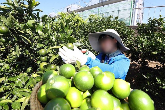 제주 서귀포시 농촌진흥청 국립원예특작과학원 감귤연구소 시험 재배지에서 연구원들이 여름에만 맛볼 수 있는 어린 감귤 '풋귤'을 수확하고 있다. / 농촌진흥청 제공