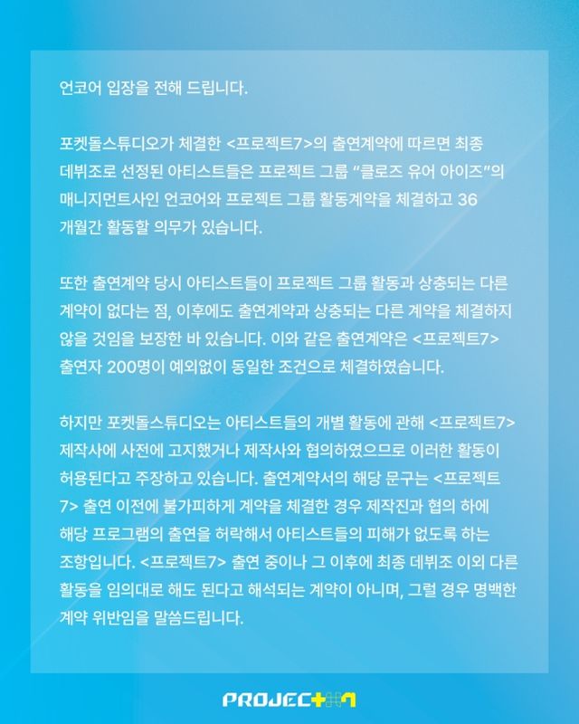 이어 “나아가 포켓돌스튜디오는 ‘프로젝트7’ 제작사에게 아티스트들의 개별 활동 일정을 사전에 고지한 사실이 없고, 담당자가 일방적으로 요청했다 하더라도 제작사가 이를 허용한다는 의사를 전달한 사실이 없다”며 “‘클로즈 유어 아이즈’ 활동과 상충되는 아티스트들의 개별 활동은 출연계약을 위반하는 행위이며, 언코어는 손해배상을 포함한 책임을 물을 수밖에 없다”고 덧붙였다.