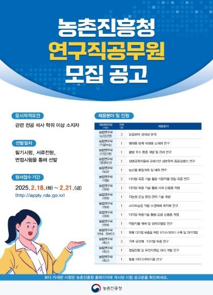 [와이뉴스] 농촌진흥청이 2025년도 연구직 공무원 경력경쟁 채용 선발 계획을 공고했다.