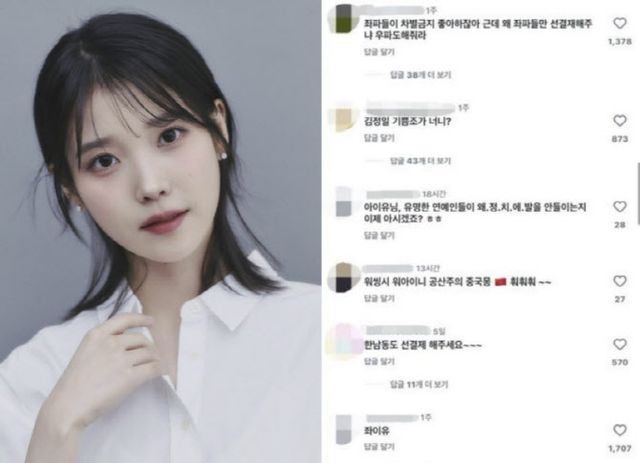 15일 윤 대통령이 체포된 뒤 지지자들은 아이유의 사회관계망서비스(SNS)에 “속이 좀 시원하냐, 마음에 드냐”, “좌이유”, “아이유 팬이었는데 많이 실망했다” 등 항의성 댓글을 잇따라 남겼다.