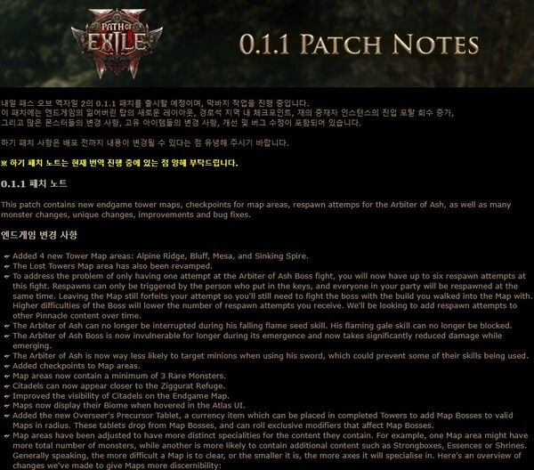 이번 패치에는 4개의 새로운 타워 맵이 추가됐다. 신규 지역은 엔드게임 플레이어들에게 새로운 도전과 재미를 제공할 것으로 기대된다. 또한, '재의 중재자(Arbiter of Ash)' 보스전에서는 최대 6번까지 부활이 가능하도록 개선된다. 부활은 열쇠를 사용한 플레이어가 트리거하며, 파티원 전원이 동시에 부활한다. 다만, 맵을 떠나면 시도가 취소되기 때문에 입장 당시의 빌드로 보스에 도전해야 한다. 난이도가 높아질수록 부활 횟수는 줄어들며, 이러한 기능은 향후 다른 콘텐츠에도 도입될 계획이다.