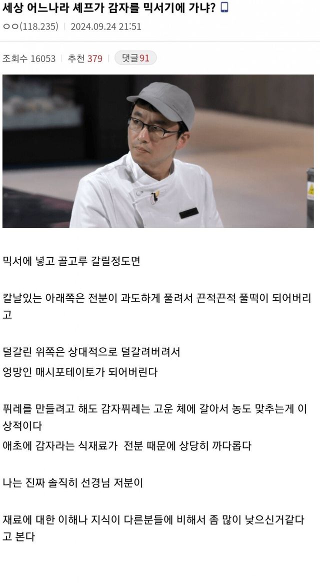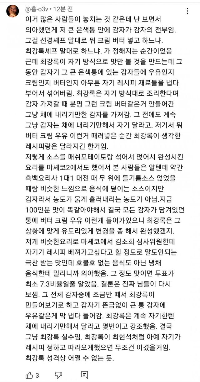 오른쪽 최강록은 혼자 쓸쓸하게 매시포테이토소스 만드는중