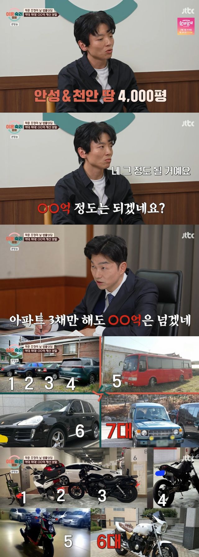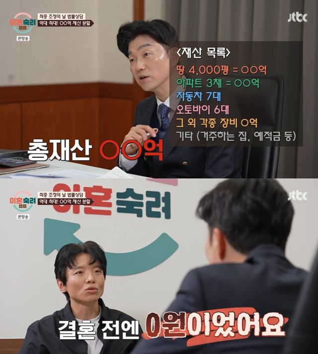 이에 변호사는 'NN억 되겠다'고 계산했고, 남편은 이어 "아파트 3채가 있다"며 거주하는 주택 제외, 억대 아파트가 세채 있어 NN억이 있다고 전했다.