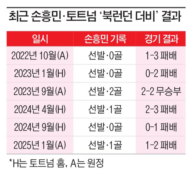 이날 패배로 토트넘은 최근 북런던 더비 3연패 포함 1무 5패에 빠졌다. 최대 라이벌이라고 하기엔 초라한 전적이다. 특히 손흥민은 이번에도 골을 넣고도 팀 패배 탓에 고개를 숙였다. 그는 최근 북런던 더비 4경기 중 3경기에서 골을 넣었으나, 이 기간 토트넘은 한 번도 이기지 못했다. 심지어 지난 2023년 9월엔 홀로 멀티골 활약을 펼치고도 무승부에 그쳤고, 이날 역시 선제골을 넣고도 역전패를 바라봤다. 손흥민의 외로운 북런던 더비 사투가 이어지고 있는 셈이다.