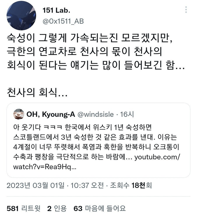 천사의 몫 : 오크통에서 위스키 숙성시 매년 2%씩 자연증발하는 현상을 비유하는 표현