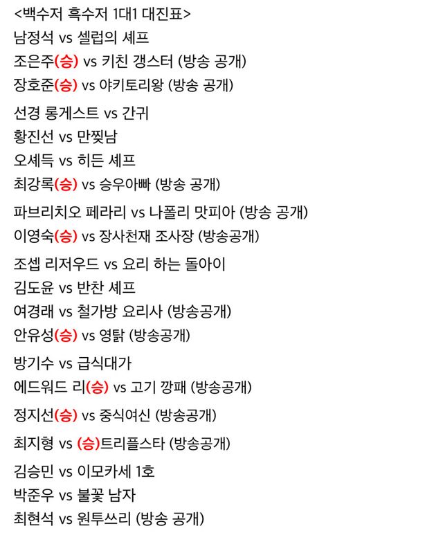 탈락 : 셀럽의셰프 / 키친갱스터 / 야키토리왕 / 간귀 / 만찢남 / 승우아빠 / 조사장 / 영탉 / 고기깡패 / 중식여신 / 원투쓰리
