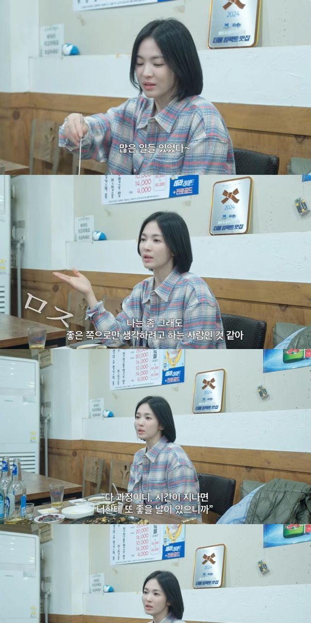 송혜교는 강민경과 술잔을 기울이다 "언니는 쭉 간거 같다"는 말에 "많은 일들 있었다"라며 허심탄회하게 이야기했다.