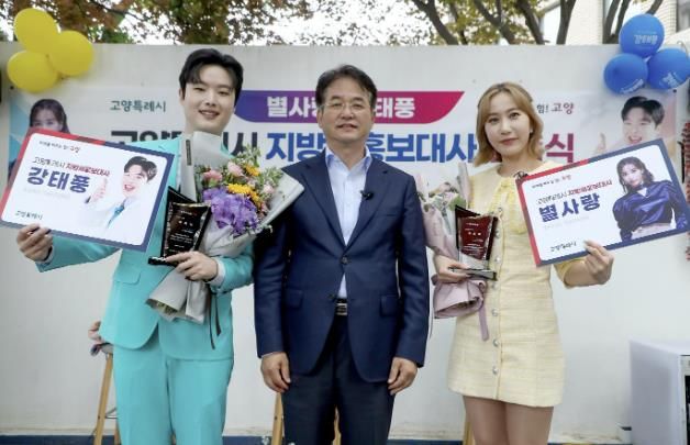 | ▲ 고양특례시 지방세 홍보대사 강태풍(왼쪽), 별사랑(오른쪽), 이동환 고양특례시장(가운데) |