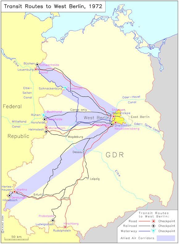 서베를린은 자유진영이지만 사면이 공산권에 둘러쌓인 육지 속의 섬으로, 서독과 자유진영의 국민들이 서베를린으로 가기 위해서는 동독 영토를 통과해야만 했다.