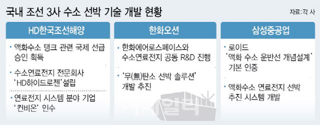 삼성중공업(010140)도 수소 기술 개발에 속도를 내고 있다. 2021년 영국 선급 로이드사에서 멤브레인형 액화 수소 화물창과 16만㎥급 액화 수소 운반선 개념설계에 대한 기본 인증을 받았다. 2022년에는 액화수소 연료전지 선박 추진 시스템 개발에 성공, 노르웨이 선급으로부터 기본 인증을 받는 데 성공했다.