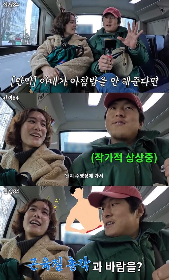 이어 "만약 아내가 아침밥을 안 해준다면, 왠지 수영장에 가서 근육질 총각과 바람이 나지 않을까, 헬스장에 가서 젊은 트레이너랑…"이라며 상상의 나래를 펼치기 시작했다.