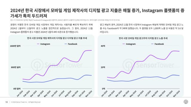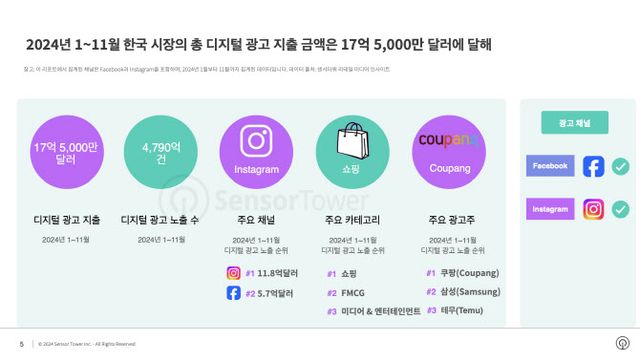 2024년 1월부터 11월까지 메타의 페이스북과 인스타그램에서 한국 시장의 총 디지털 광고 지출 금액은 17억5000만 달러(2조 5449억원)에 달했으며, 총 노출 수는 약 4800억 건에 이른다.