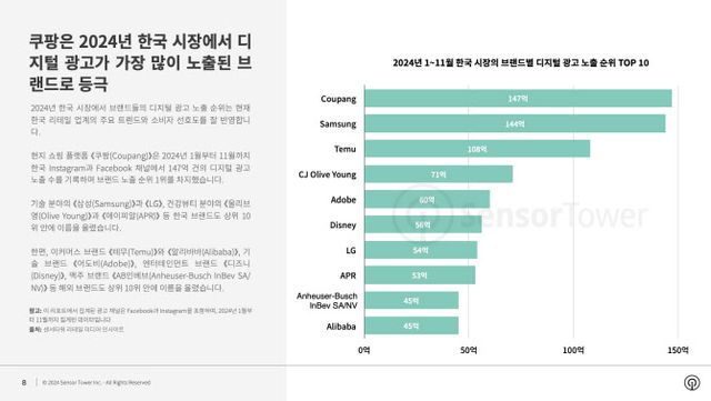 ‘쿠팡’은 2024년 1월부터 11월까지 147억 건의 디지털 광고 노출을 기록하며 1위를 차지했으며, 삼성, LG, 올리브영 등 다양한 한국 브랜드들도 상위 10위 안에 포함됐다. 글로벌 브랜드인 ‘테무’와 ‘알리바바’, ‘어도비’ 등도 상위 광고주로 등장했다.
