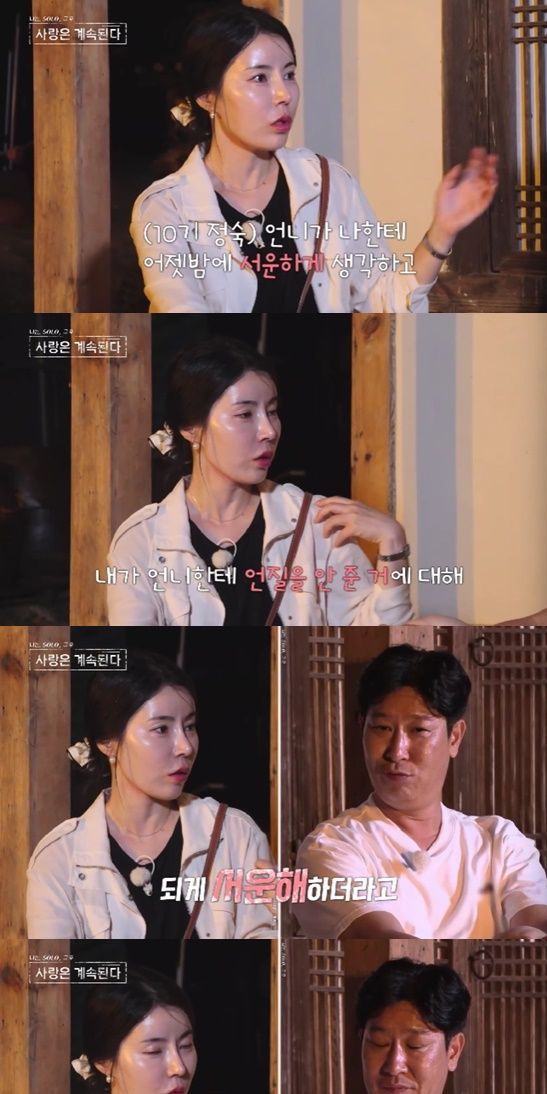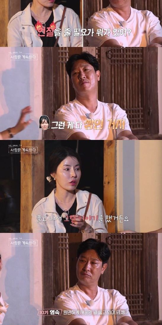 10기 영숙은 "2대1 데이트 다녀와서도 언니가 우는데 내가 바로 나가고 그랬다. 그런 게 다 쌓였다. 언니와 화해해서 그런 건 풀었는데 풀고 나서 그런 이야기를 했다. '오늘 가서 혼도 내고 풀고 와야겠다. 오빠와 관계를 원만하게 서운한 걸 풀고 와야겠다'라고 하는데 내가 어떻게 따라가냐"라며 미스터 백김을 달랬다.