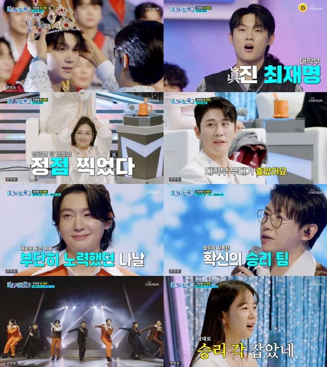 이날 방송된 '미스터트롯3' 4회에서는 본선 1차 팀 데스매치가 그려졌다. 특히, 팀 데스매치 진선미가 공개돼 이목을 집중시켰다. 대망의 팀 미션 진(眞)은 대학부 최재명이었다. 쟁쟁한 현역 가수를 제치고 진의 왕관을 쓴 최재명은 눈시울을 붉히며 감격에 겨워했다. 최재명은 대학부를 이끌며 완성도 높은 '창귀' 무대를 완성, 시리즈 사상 최고의 극찬을 한 몸에 받았다. 리더로서 완벽에 가까운 무대를 이끈 것은 물론, 마치 주인공처럼 돋보였던 미친 존재감도 시청자들의 원픽을 부르기에 충분했다는 평.