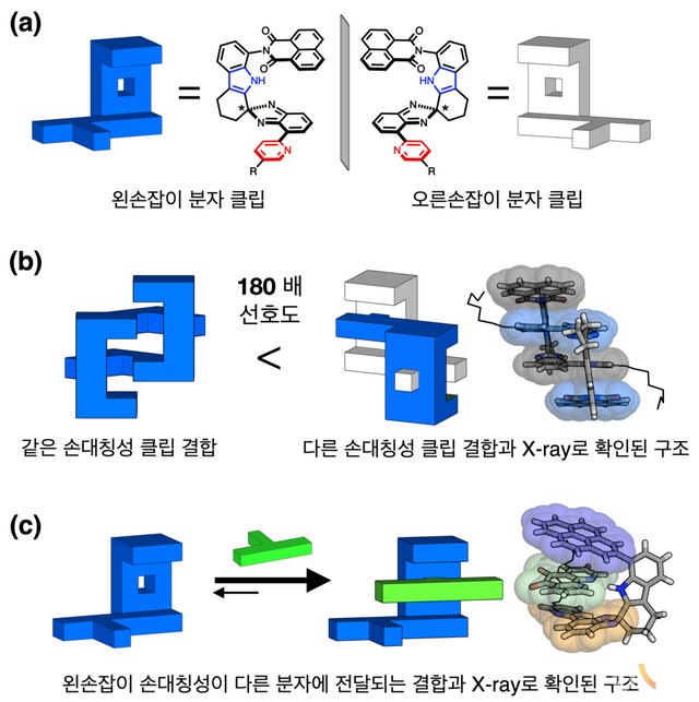 이동환 교수 연구진은 이러한 상호 견제 원리를 성공적으로 구현한 ‘분자 클립’을 개발했다. 한글 'ㄷ'(디귿)자 형태의 이 클립 모양 분자는 두 개가 깍지 낀 모양으로 결합하여 하나처럼 거동하는 흥미로운 3차원 구조를 이룬다. 연구진이 개발한 분자 클립은 서로 다른 카이랄성을 가진 클립끼리 (마치 왼손과 오른손을 깍지 낀 것처럼) 매우 강하게 결합하는 반면, 같은 카이랄성 클립끼리는 매우 약하게 결합한다. 숫자로 비교하면 무려 180배에 달하는 이러한 높은 입체 선택성은 지금까지 알려진 어떤 분자 시스템보다 크다. 이러한 높은 선택성은 분자 클립의 정교한 설계에서 비롯된다. 클립 구조는 레고 블록처럼 요철 구조를 가지며, 들어간 부분에는 수소결합 주개를, 튀어나온 부분에는 수소결합 받개를 배치했다. 그 결과, 왼손잡이와 오른손잡이 클립의 요철은 정확히 상보적이어서 강한 수소결합을 형성하지만, 같은 손잡이 클립끼리는 요철이 맞지 않아 결합 세기가 약하다. 이러한 분자 설계를 통해 상호 견제 가설의 중요한 전제 조건인 ‘반대 카이랄성 사이의 강한 결합’을 실현할 수 있었다.