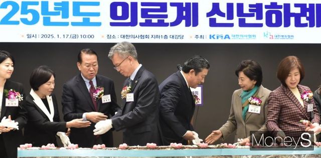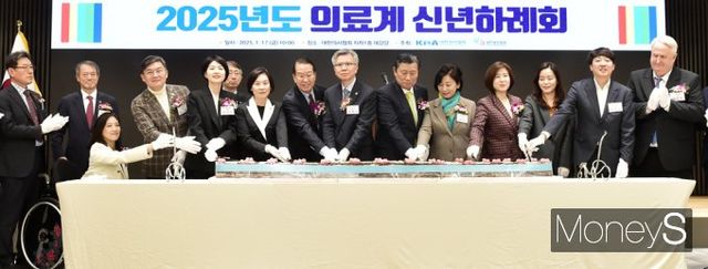 2025년 의료계 신년하례회가 17일 서울 용산구 이촌동 대한의사협회에서 열린 가운데 권영세 국민의힘 비대위원장, 김택우 신임 대한의사협회(의협) 회장, 이성규 대한병원협회(KHA) 회장 등 국회 및 의료계, 의학회 인사들이 축하 떡케익 컷팅식을 갖고 있다.