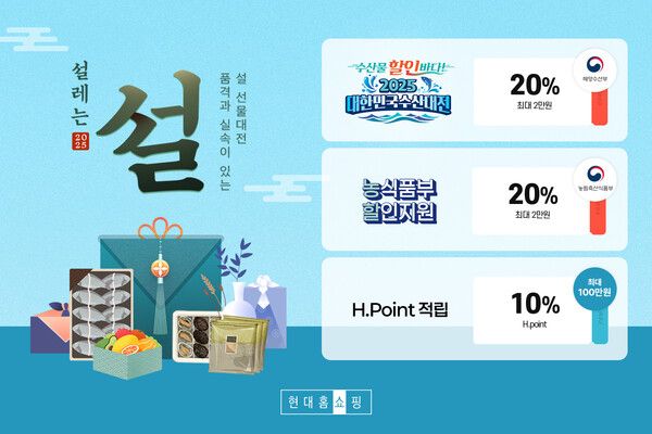 이외에도 현대H몰에서 오는 24일까지 '설레는 설' 설 식품 전용 기획전도 개최한다. 설 인기 식품을 최대 25% 할인된 가격에 선보이며, 행사 기간 내 해당 상품을 2건 이상 구매하면 누적 구매 금액의 10%를 H포인트 리워드로 제공한다.