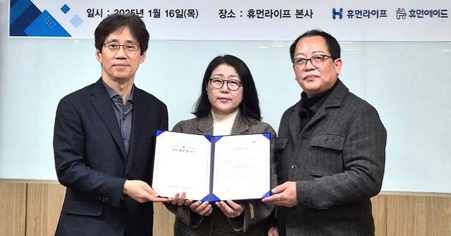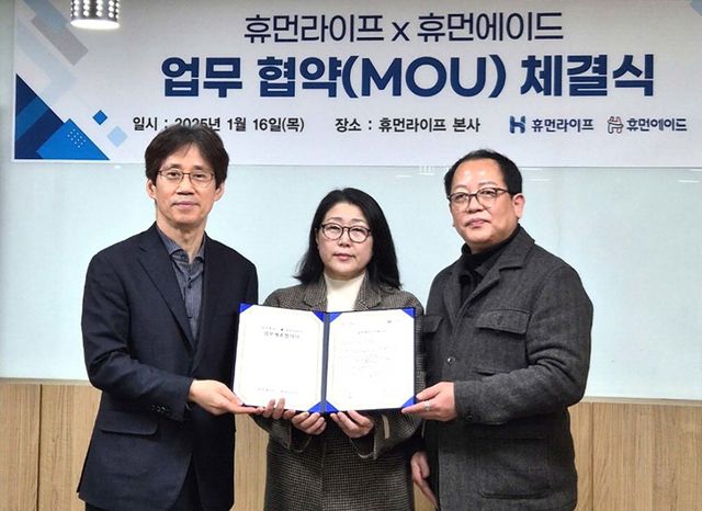 박남하(왼쪽) 휴먼라이프 대표, 휴먼에이드의 김동현(오른쪽) 대표, 고명경 이사가기념촬영을 하고 있다. / 휴먼에이드